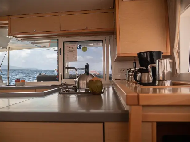 Inside, the bright and spacious saloon is naturally ventilated and features an open-plan layout with a lounge and galley designed for socialising and relaxation. Entertainment options include a music system, and diving gear can be arranged upon request.